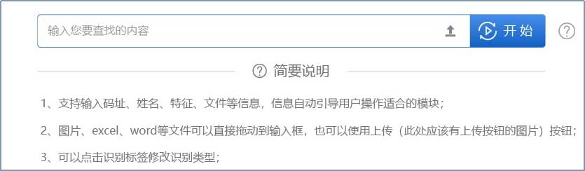 建設(shè)統(tǒng)一入口界面,實(shí)現(xiàn)用戶的多種輸入方式,包括但不限于各類碼址、名稱、地址、特征片段、數(shù)據(jù)文件、文檔文件等。支持通配符方式;支持中英文兩個語種的輸入支持和判斷,支持中英文混合輸入;支持多條信息或文件的輸入。